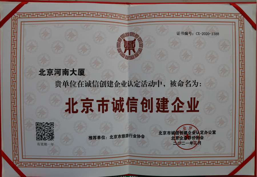 2020年北京河南大厦经过北京市旅游协会的推荐,参加了北京市企业评价协会组织的“北京市诚信创建企业”认定活动。今年4月北京企业评价协会和北京市旅游行业协会对2020年“北京市诚信创建企业”终审结果进行公告,北京河南大厦在此次诚信创建企业认定活动中,被命名为:北京市诚信创建企业。